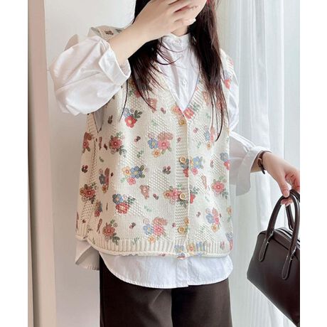 さまざまなプリント柄が楽しいニットベスト。遊び心あふれるデザインは、どの柄を選んでも日常コーデにアクセントを加えます。Vネックとボタン仕様が、重ね着しやすくポップでキュートな印象をプラス。シンプルなインナーと合わせることで、柄の魅力が引き立ちます。