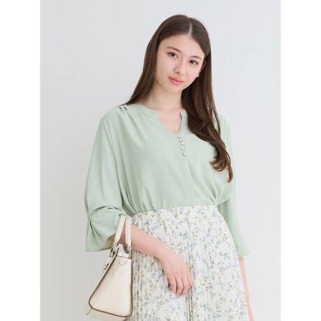 ショルダーやスリーブに寄せられたタックが表情感を演出するブラウス。