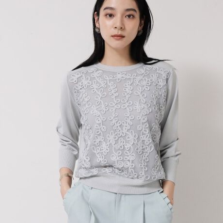 繊細なコードレースを贅沢に施した華やかなニットは、大人の装いにぴったりな1枚です。