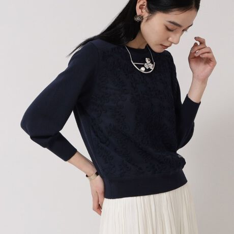 繊細なコードレースを贅沢に施した華やかなニットは、大人の装いにぴったりな1枚です。
