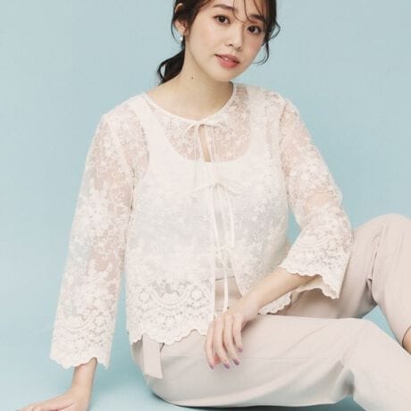 ・シアー素材に施されたフラワー刺繍が、女性らしさを引き立ててくれます。