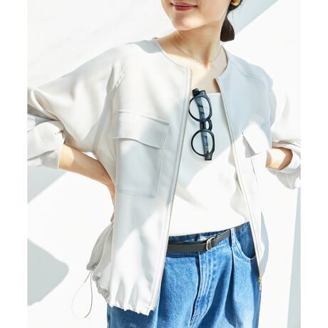 フロントは金属ファスナーで辛さをプラスし、大きめのポケットディテールがデザインポイントです。