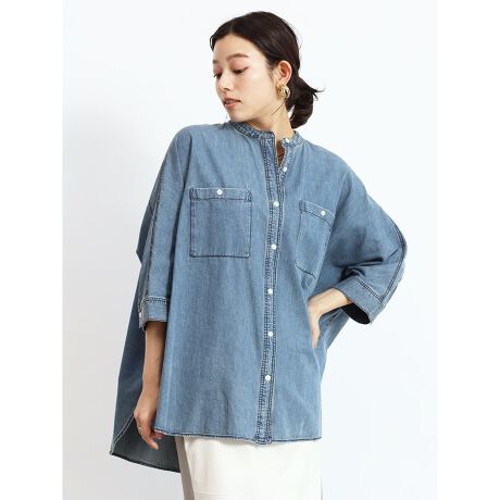 オーバーなサイジングがこなれ感溢れるデニムのバンドカラーシャツ。
