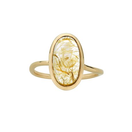 オーバルカボションカットのルチルクォーツをイエローゴールドのラインで縁取りしたリング。