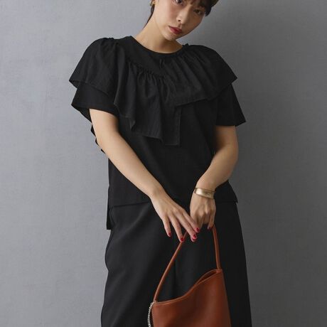 ボリューミーになりがちな胸元のフリルデザインは異素材使いで軽やかに仕上げました。