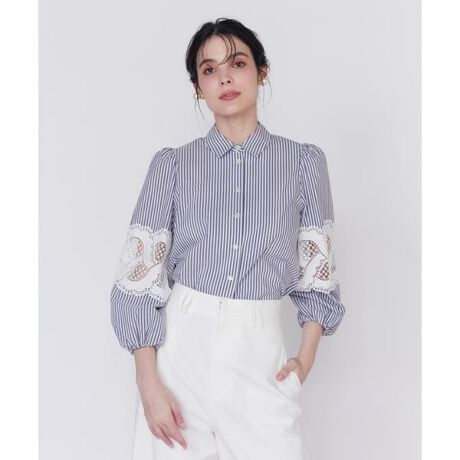 すっきりとした白×ブルーのストライプ柄と、レースドッキングが特徴的なブラウス。ノンステッチ仕様で、小さめの衿と貝ボタンが上品さとクラシックな魅力を引き立てます。袖にはオリジナルの柄でデザインされたレースを切り替えて、程よく透け感を持たせることで、クチュール感あふれる仕上がりに。袖口はゴムギャザー仕上げで、ボリューム感があり、袖をまくって着ることも可能。伸縮性に優れたストレッチシャツ生地を使用しており、着心地が良く、動きやすさも抜群です。爽やかな白×ブルーのストライプ柄が印象的で、シーズン問わず活躍するアイテムです。・水洗い可【素材/レース】ポリエステル糸を使用したケミカルレースで、インパクトのある太幅のデザインが特徴です。ドットや粗めのメッシュ、スカラ、ハシゴなど、シンプルなモチーフで構成されており、糸だけで作り出された立体感が魅力。ドットのボリュームやメッシュの透け感が、ケミカルレースならではの奥行きのある仕上がりを実現しています。■サンプル撮影商品■こちらの商品はサンプルでの撮影となっております。実際の商品とは、サイズや色味、素材、デザイン等の仕様が若干変更になる場合がございます。