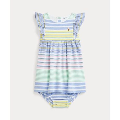 カラフルなストライプとフリルトリムで可愛らしいディテールをプラスしたアイテム。オックスフォード シャツドレスのルックに、ポロシャツに使用するコットンメッシュ生地の快適さと動きやすさを組み合わせた一着 / ・Ralph Laurenのコットン製品を選ぶことで、環境の保護と修復に努めながら、コットン業界が今後も成長を続けられるように支援するBetter Cotton(TM)ミッションへのRalph Laurenの取り組みをサポートすることになります・本商品は物質収支方式に則って材料を調達しているため、全ての製品にBetter Cotton(TM)が含まれない可能性があります。・エンパイアウエストのシルエット・左胸にマルチカラーのシグネチャーのポニー刺繍・ラウンドネック / 首の後ろに4つボタンのプラケット / 肩とトップス部分にフリル付き / シャーリング入りのウエスト・ヨークにジャージーの裏地付き / お揃いのブルマー付き※商品の色味は、光のあたり具合など諸条件により色感が多少異なって見える場合がございますので予めご了承下さい。※注意:柄の配置は、商品によって異なります。 【素材】・本体:綿 100% ヨーク裏地部分:綿 100% 装飾部分を除く パンツ 本体:綿 100%【生産国】インドネシア