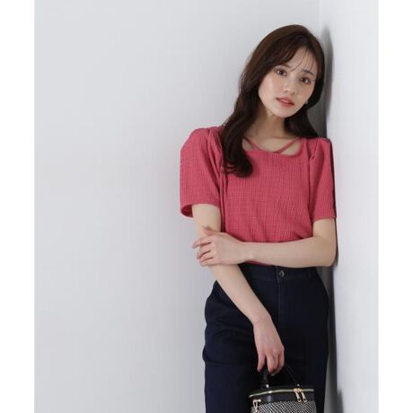 襟の前から後ろへあしらった細リボンがポイントのカットソーです。ホルターネックのようなディテールで、抜け感と涼しげな雰囲気をプラス。表面感のある素材なので単調すぎないコーディネートに見せてくれます。