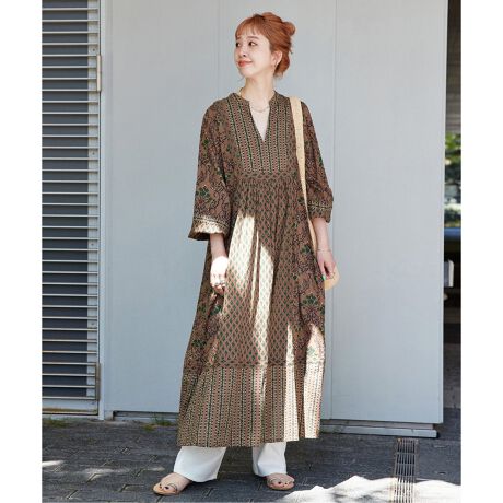 3種類の柄を組み合わせたパネルプリントのワンピース。
