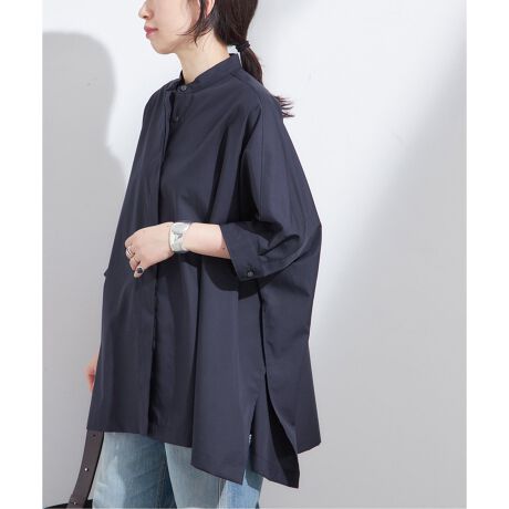 スタンドカラーできっちりとした見た目にもかかわらず、ゆったりして涼し気なシャツブラウス。