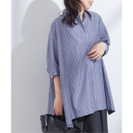 スタンドカラーできっちりとした見た目にもかかわらず、ゆったりして涼し気なシャツブラウス。