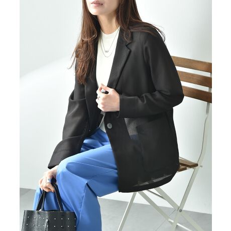 さらりとした肌さわりが特徴のシアーメッシュ素材で作られたジャケット。ボトムスや体系を選ばず着まわしやすい着丈にこだわった1枚です。1つボタンのすっきりしたシルエットは女性らしく、インナーも合わせやすいのがポイントです。