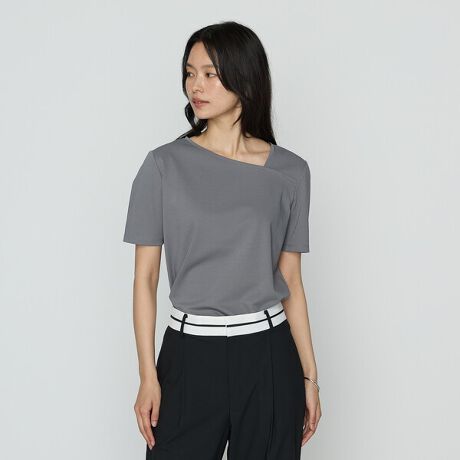 デコルテのアシンメトリーなカッティングラインがシャープで顔周りをすっきり見せてくれるきれいめTシャツです。
