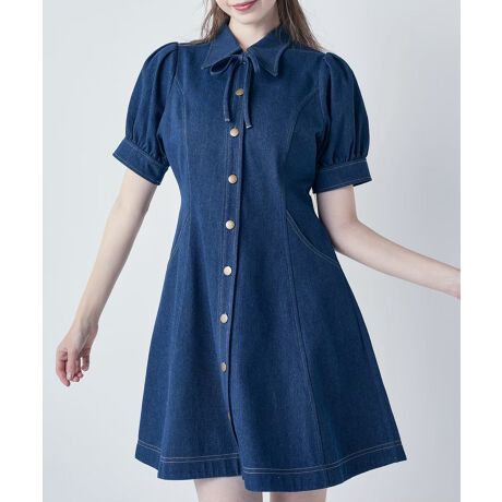 【2サイズ展開】リボンタイ付きパフスリーブデニムワンピース【洗える】