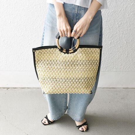 サークル型のハンドルが印象的なトートバッグ。