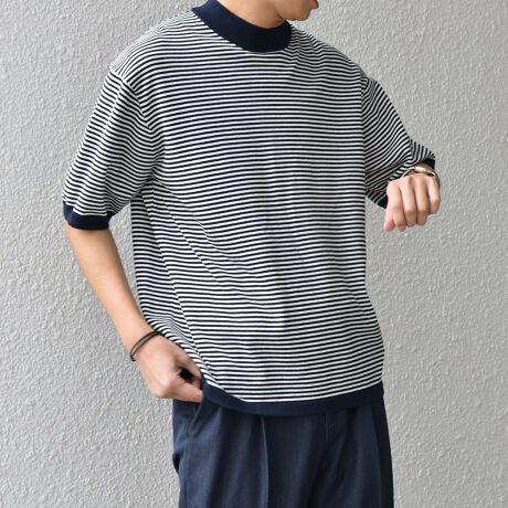 大人のリラックス感を醸し出すモックネック仕様のニットTシャツ。