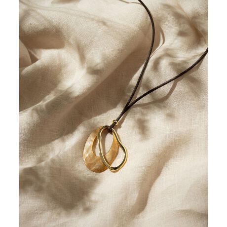 シェルリングとメタルリングが重なったアクセントになるデザインのトップネックレスです。紐スライドのデザインなので簡単に着脱ができ、気分に合わせてお好みの長さで着用していただけます。メタルのリングはニュアンス感のある抑揚をつけたデザインになっています。程よいボリューム感でシンプルなコーディネートのアクセントに最適です。カラーは大人の可愛さを感じさせるホワイト(#001)、カジュアルなスタイリングにも合わせやすいブラウン(#035) 、シックな雰囲気のブラック(#005)の3色展開です。