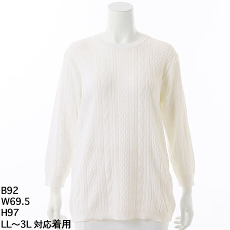 さらっとした綿混素材、コーディネートし易いベーシックデザイン、ケーブル柄ニットプルオーバー
