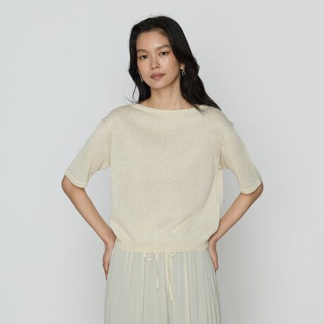 五分袖のすっきりした腕周りがジャケットなどの羽織りものにも着回しやすいラメリネンニットプルオーバーです。