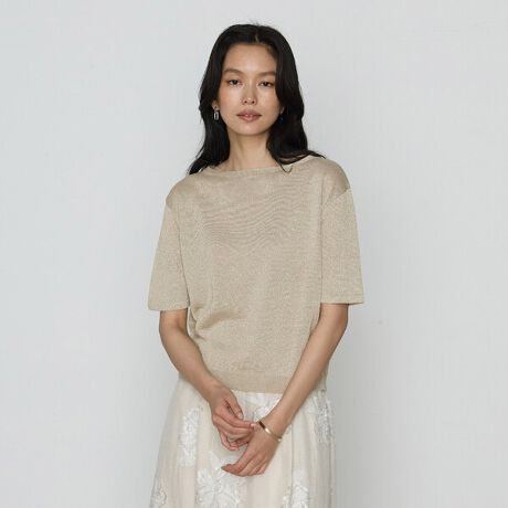 五分袖のすっきりした腕周りがジャケットなどの羽織りものにも着回しやすいラメリネンニットプルオーバーです。