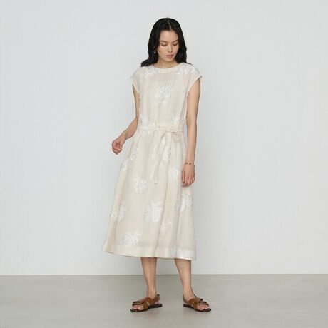 麻のカットジャカードがナチュラルな印象のフレンチスリーブドレスです。