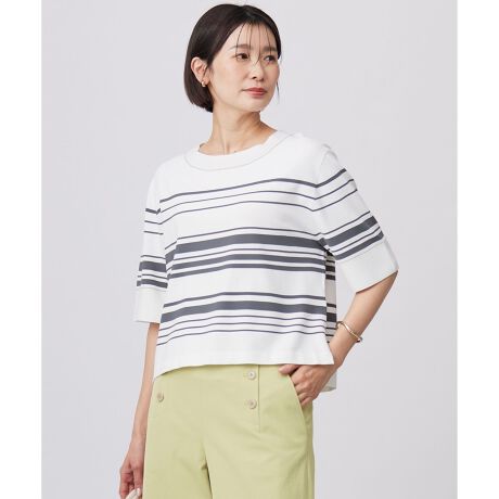 ■デザインTシャツライクに着用できる、ボーダーニットプルオーバー。身幅はややゆとりを持たせ、ボディラインを拾わず優しく身体にフィットするサイズ感にこだわりました。衿と袖口にはガーター編みを入れ、全体のバランスを引き締め、ラメ糸で上品にトレンド感を演出した1着です。身体離れの良いシルエットでさらりと着用ができ、真夏まで活躍します。ボーダー柄がコーディネートのアクセントとなり、シンプルなスカートやパンツに合わせるのもおすすめです。