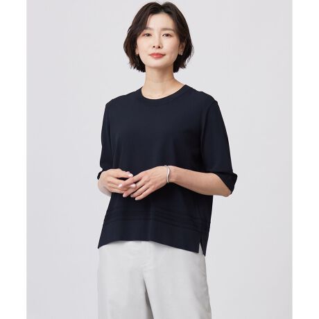 ■デザイン清涼感のあるクルーネックの5分袖ニットプルオーバー。気になる二の腕をカバーしてくれる袖丈ですっきりとした印象を与えます。初夏、真夏から初秋まで長く着ていただけます。袖口と裾に入っている編柄がアクセントになっており、同素材アイテムのクルーネックカーディガンとのアンサンブル着用もおすすめです。素材感がこなれ感を演出し、1枚着として上品にきまる汎用性の高いアイテムです。