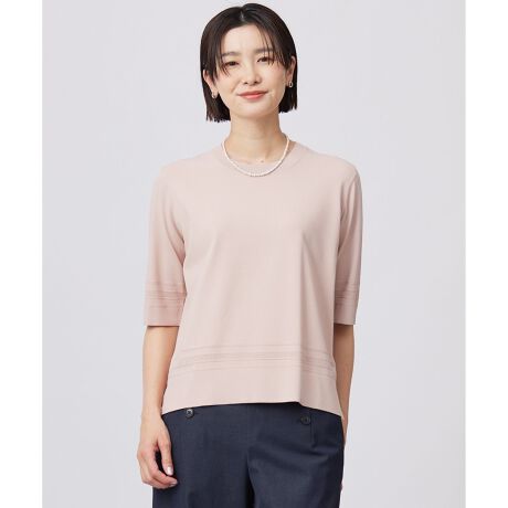 ■デザイン清涼感のあるクルーネックの5分袖ニットプルオーバー。気になる二の腕をカバーしてくれる袖丈ですっきりとした印象を与えます。初夏、真夏から初秋まで長く着ていただけます。袖口と裾に入っている編柄がアクセントになっており、同素材アイテムのクルーネックカーディガンとのアンサンブル着用もおすすめです。素材感がこなれ感を演出し、1枚着として上品にきまる汎用性の高いアイテムです。