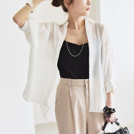 前開きタイプなので、キャミやタンクトップ、ワンピースなどの羽織りとしても活躍します。
