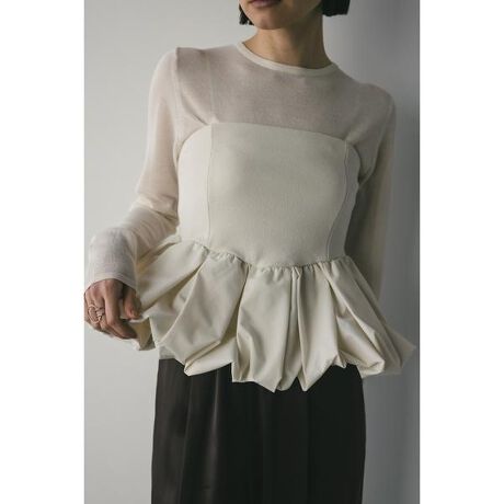 モデル身長162cm(FREEサイズ着用)14ゲージの細番手で編み立てた繊細で程よい透け感のあるニットTと布帛のボリュームフリルが可愛いペプラムビスチェとのセットアイテム。スタイリングにメリハリをつけ、立体的なシルエットに導きます。ビスチェ上辺にはゴムを入れているので安定感も◎。リブ編みでラインをすっきり見せてくれます。透け感ニットT部分あり、ストレッチあり。【お手入れ方法】手洗い可