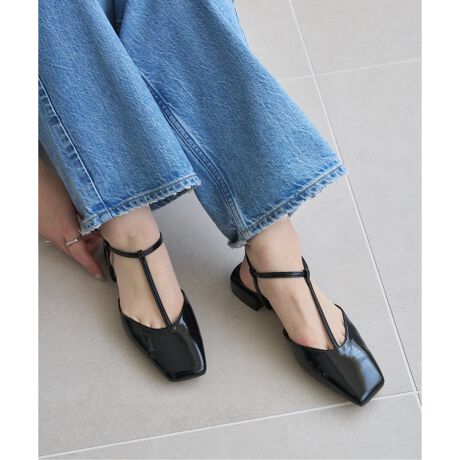 華奢なTストラップとオーバーヒールで履くだけでおしゃれ見えするフラットシューズです。
