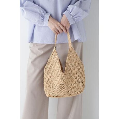[型番:0775180400]夏シーズンには欠かせないシンプルなラフィアバッグです。手持ちでも肩掛けでもバランスが取りやすく夏のスタイルにはかかせません。接ぎ目があることで立体感が出るデザインがポイントです。