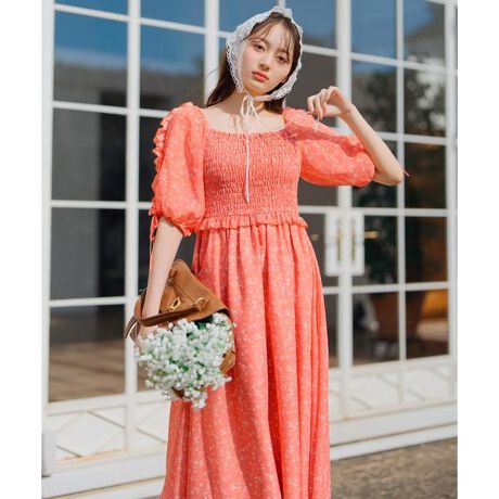 オリジナルフラワーの軽やかなシャーリングワンピース【Design】・ほんのりと透け感のあるミニフラワー柄の生地を使用した春服ワンピース。・スクエアネックデザインのデコルテ見せで、華奢な雰囲気に◎・スリーブにはフリルをあしらいフェミニンムードをプラスしました!・身頃はシャーリング仕様で伸縮性があり、リラックスしてご着用いただけます♪・袖口部分のリボンで絞り具合の調整が可能。・華やかな花柄に加えて、フリルやフレアシルエットが躍動感のあるスタイリングを叶えます!・キャップやスカーフなどの小物をプラスすることでより今っぽいコーディネートをお楽しみいただけます。【Fabric】・軽い着心地のさらりとした生地を使用。・ご自宅でお手入れが出来るのも嬉しいポイント♪・ホワイト、レッド、ネイビーの3色展開となります。【Care】手洗い可能
