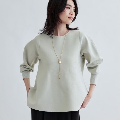 シンプルな中にも洗練された印象を与えるペプラムニット。