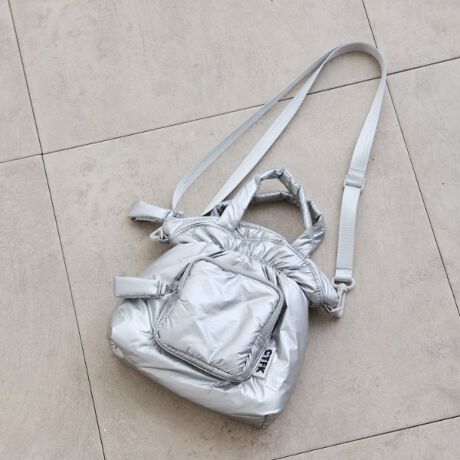 立体的なアウトポケットとぷっくりとした巾着風のシルエットがポイントです。