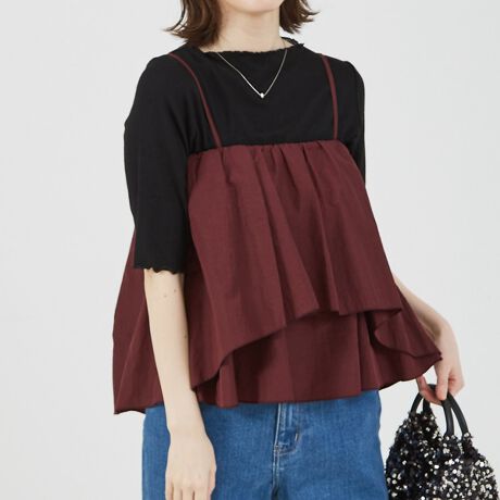 トレンドのデザインと素材で仕上げたビスチェ。前身頃のみティアードのフリルデザインで、後ろ姿はすっきりシルエットに。肩ひもはアジャスターつきなので長さ調節可能。コンパクトな着丈ですが素材の立体感のおかげで体型カバーも叶います。