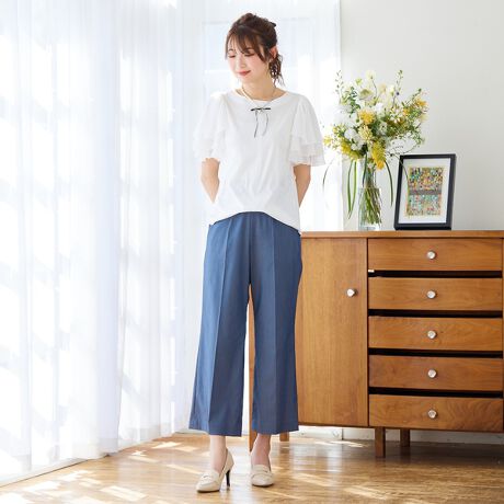 センタープレスにワイドシルエットなのスタイルアップ効果も期待でき上品な印象のアイテム。