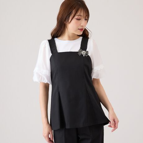 シャンブレー素材でハンサムに仕上げ、肩ひものプリーツ風デザインが可愛いアクセントに。