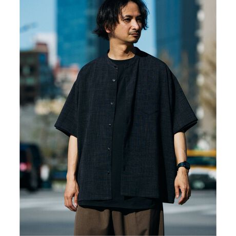 シンプルでありながら、ほんの少しオーバーサイズに仕上げて、リラックス感をプラスした半袖シャツです。落ち感のあるバンドカラーが大人っぽさを演出し、キレイめな印象を保ちながらも、ラフに着こなせるデザインに仕上げました。