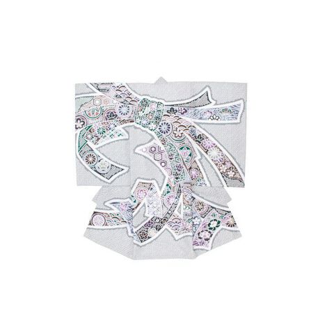 絞り調の染柄で束ね熨斗、龍や鳳凰、勇ましい猛虎に鷹や富士などが描かれたレトロモダンなデザインです。