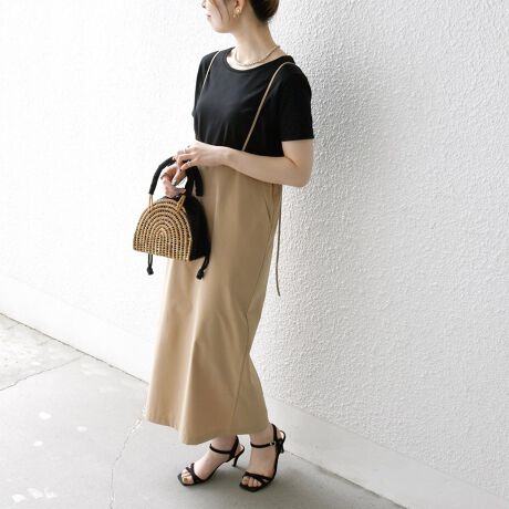 【ベージュ】ワンピース:ベージュ、Tシャツ:ブラック