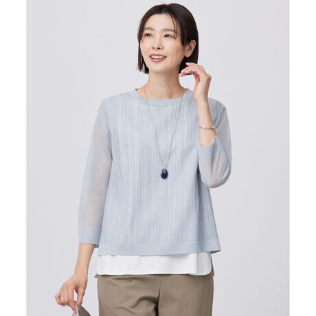 ■デザイン身頃は繊細なレーシー編み、袖は程よい透け感のあるプルオーバー。身頃のみレーシー編みをあしらうことで、派手すぎず品のある華やぎアイテムに。1枚着としてはもちろん、ジャケットのインナーとして着映える1枚に仕上がっており、7分袖丈で長いシーズンご着用頂けます。お出かけコーデを彩る春に役立つアイテムで、ボトムを選ばない汎用性の高さも魅力です。