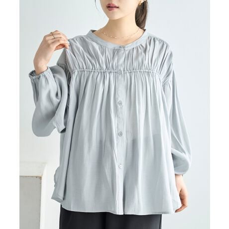 前後身頃に施されたシャーリングが、シルエットに奥行きを与え、大人の余裕を感じさせる仕上がりに。