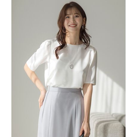 ・華やかなサテン素材のTブラウス・華奢に見えるよう設計された立体的なタックスリーブは気になる二の腕もしっかりカバー・裾はシャツテールでインせずともきれいなスタイリングに仕上がります ■仕様