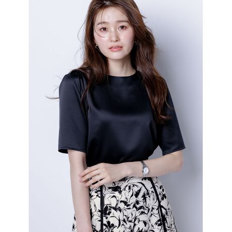 ・華やかなサテン素材のTブラウス・華奢に見えるよう設計された立体的なタックスリーブは気になる二の腕もしっかりカバー・裾はシャツテールでインせずともきれいなスタイリングに仕上がります ■仕様