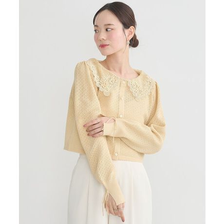 大きめのレース襟がアクセントになったカーディガン。レーシーな編み柄で程よくレトロ感があり、トレンドライクな着こなしが楽しめます。袖口リボンとスリットディテールがエッジの効いたアクセントをプラス。前ボタンを開けて羽織としても着用でき、様々なスタイリングにマッチするおすすめのアイテムです。