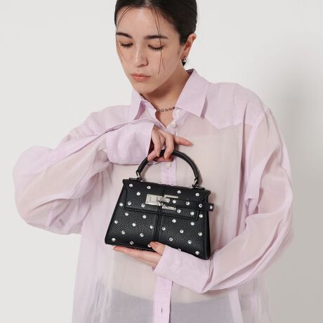 人工のストーンを散りばめたデザインが目を引くハンドバッグ。