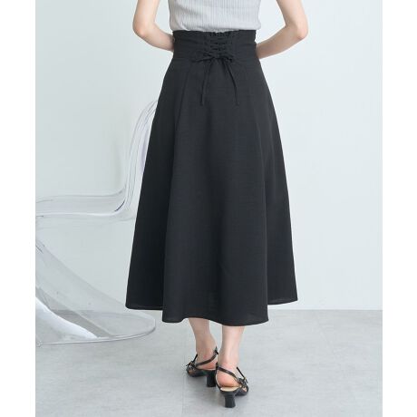表面感の綺麗な素材で仕立てたデザインスカート。裾に向かってふんわり広がるシルエットにバックのレースアップディテールがフェミニンな雰囲気です。ウエストには一部ゴムを配し、快適な穿き心地を実現。トップスイン・アウトのどちらでも合わせやすく、ロングシーズン活躍してくれるおすすめのアイテムです。