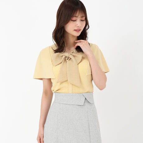 異素材使いのボウタイリボンが愛らしいアクセントをプラスするニット。ケープのような袖で気になる肩周りや二の腕を優しくカバーしてくれます。身頃はリブ編みで切り替え、すっきりフィットする着用感なのも魅力。お仕事やデートなどの様々なスタイリングにも活躍してくれる1着です。■fabric透け感[無し]裏地[無し]伸縮性[有り]生地の厚さ[普通]