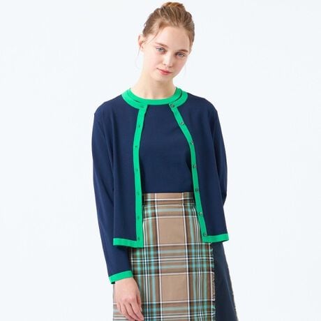 <バイカラートリミングがアクセントのクルーネックカーディガン>